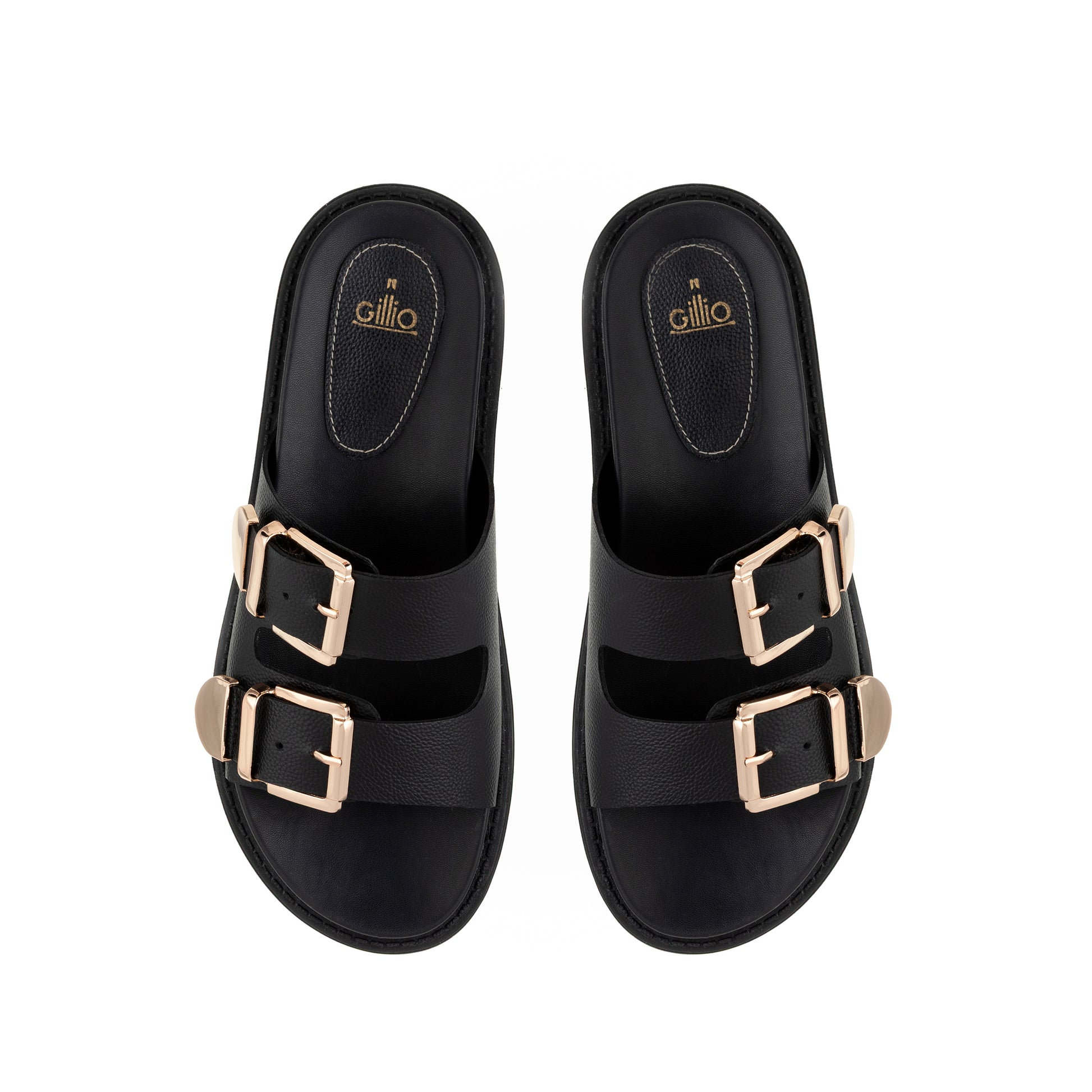 Sandalia estilo slide, con doble hebilla metálica dorada, estética minimalista + elegante, muy limpia y moderna. Perfecta para looks frecos, neutros y sofisticados.