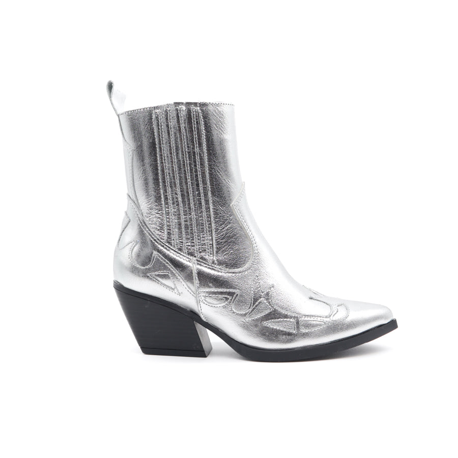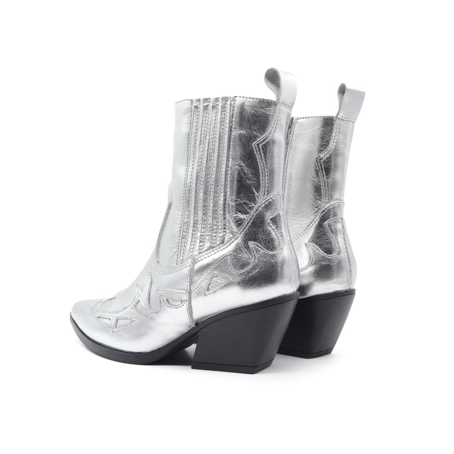 BOTÍN COWBOY CORTO CON INCREIBLE DISEÑO DE PESPUNTE EN PIEL PLATEADA, CIERRE INTERNO Y ELÁSTICO EXTERNO PARA MAYOR AJUSTE.