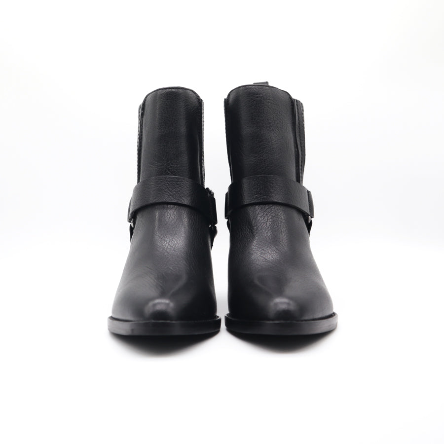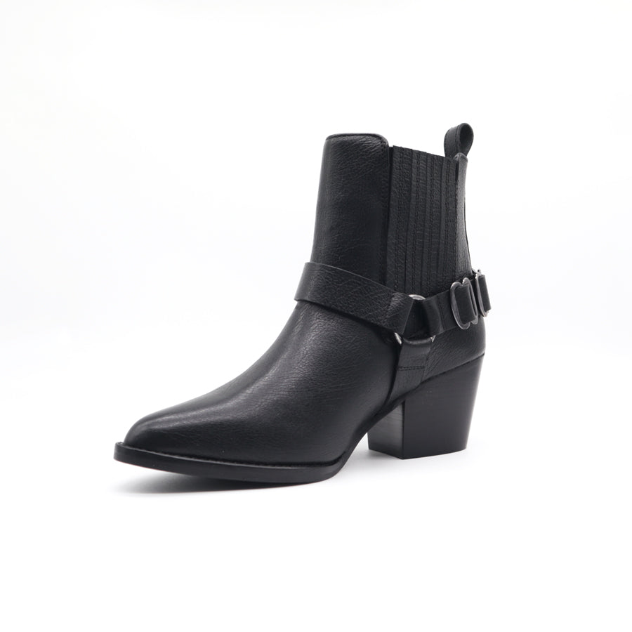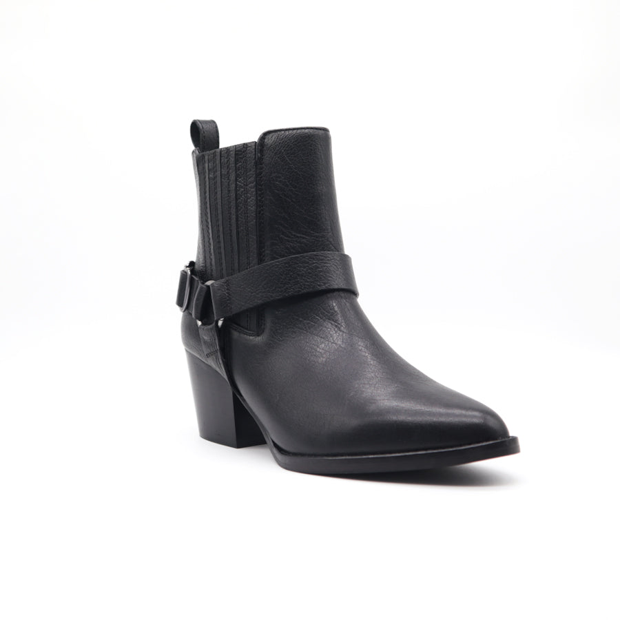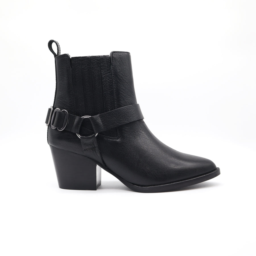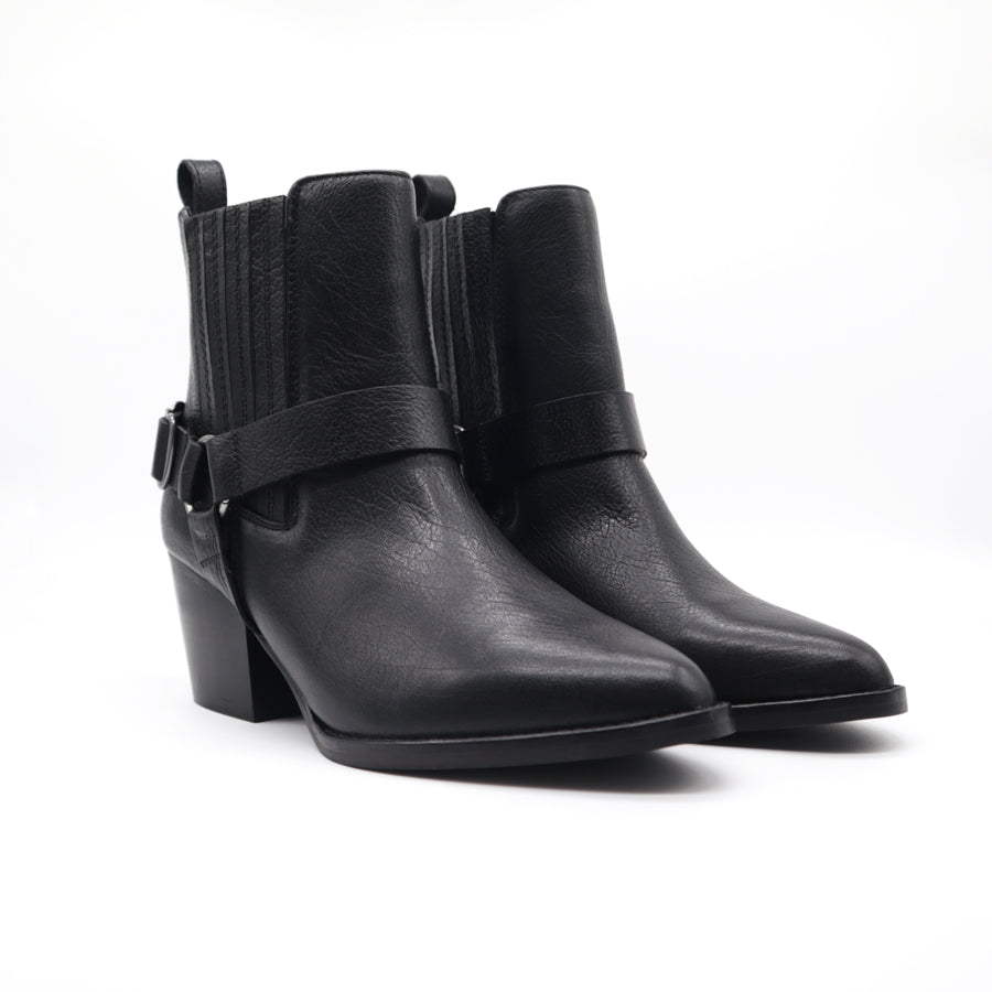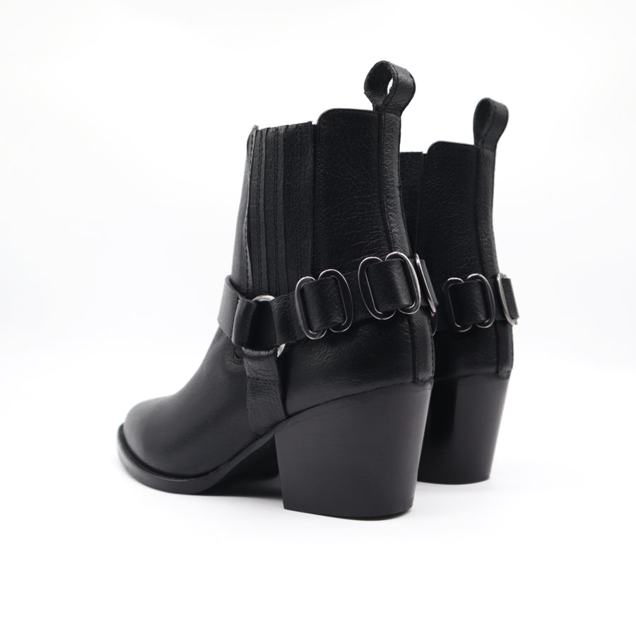 Botín cowboy corto, diseño en latigo con herrajes tono plateado, elástico lateral y piel super suave.